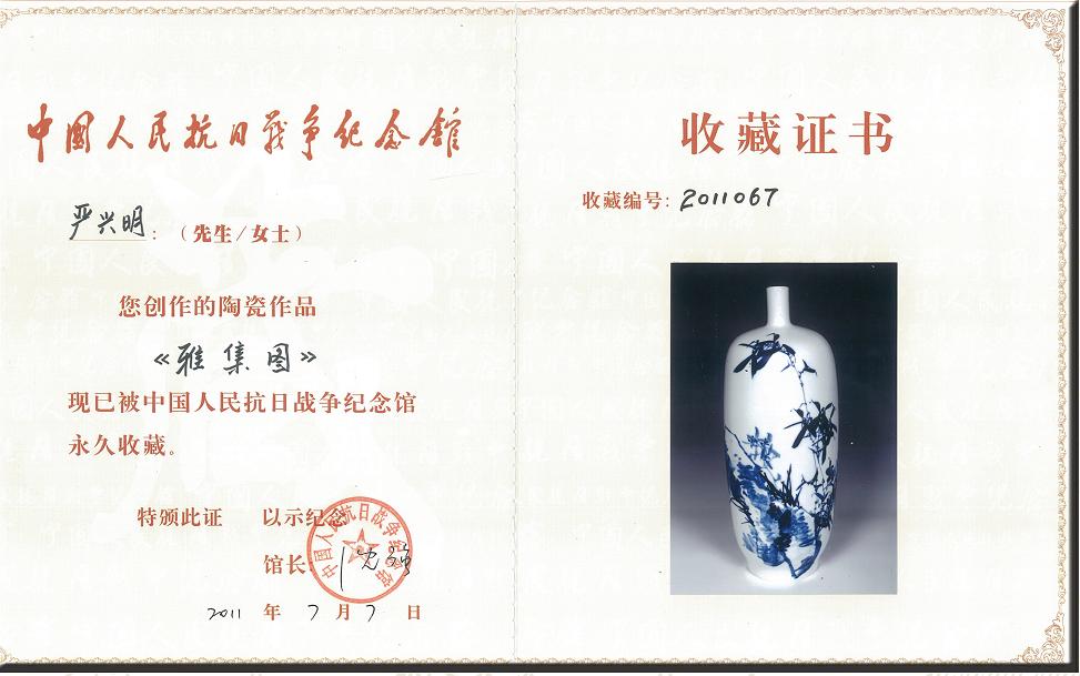 2011年7月7日,青花作品《雅集图》被“中国人民抗日战争纪念馆”收藏。