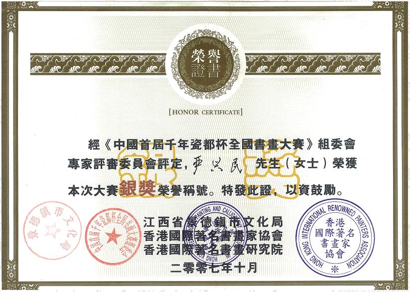 2007年10月,作品荣获《中国首届千年瓷都杯全国书画大赛》“银”奖。