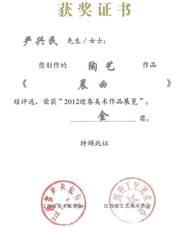 2012年,青花作品《晨曲》荣获“2012年迎春美术作品展览”“金”奖。