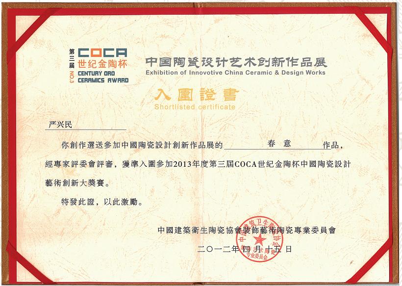 2012年4月15日,作品《春意》获准入围参加2013年度第三届COCA世纪金陶杯“中国陶瓷艺术设计创新”大奖。